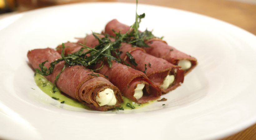 Canelones de pastrami, crema de queso, pesto de pistachos y rúcula