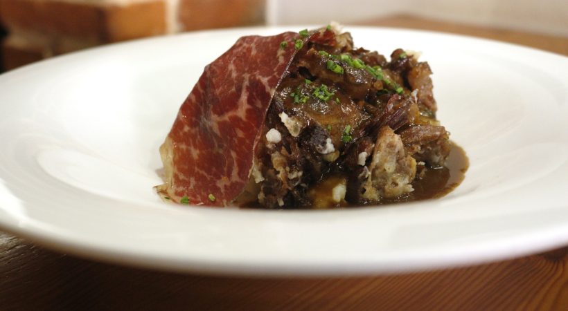Coulant de patata, rabo estofado y cecina de Wagyu (Entrepeñas)
