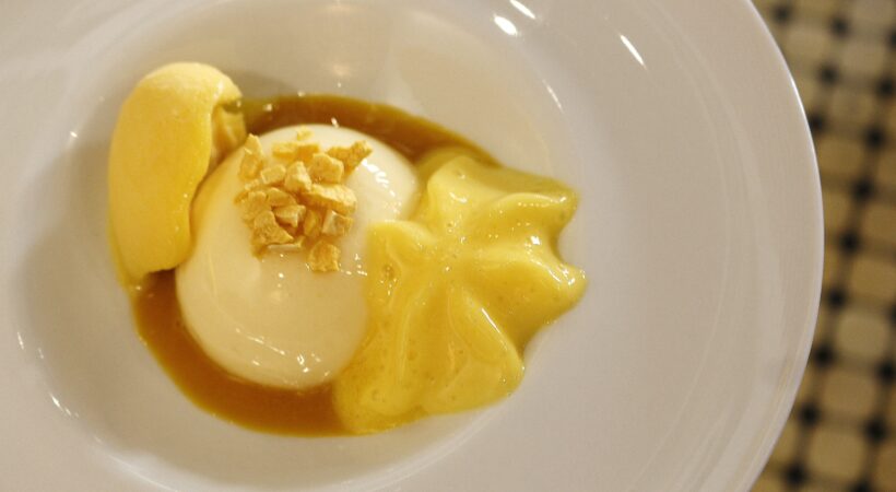 Semifrío de mango, crispies y sorbete