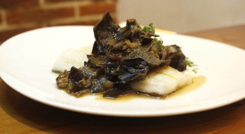 Lomo de bacalao asado, oreja de Judas y ajo blanco
