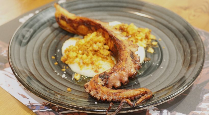 Pata de pulpo brasa, chirivía y migas de pimentón