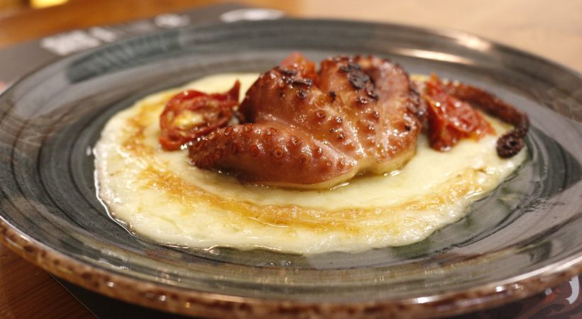 Provolone, pulpo asado y tomate semiseco